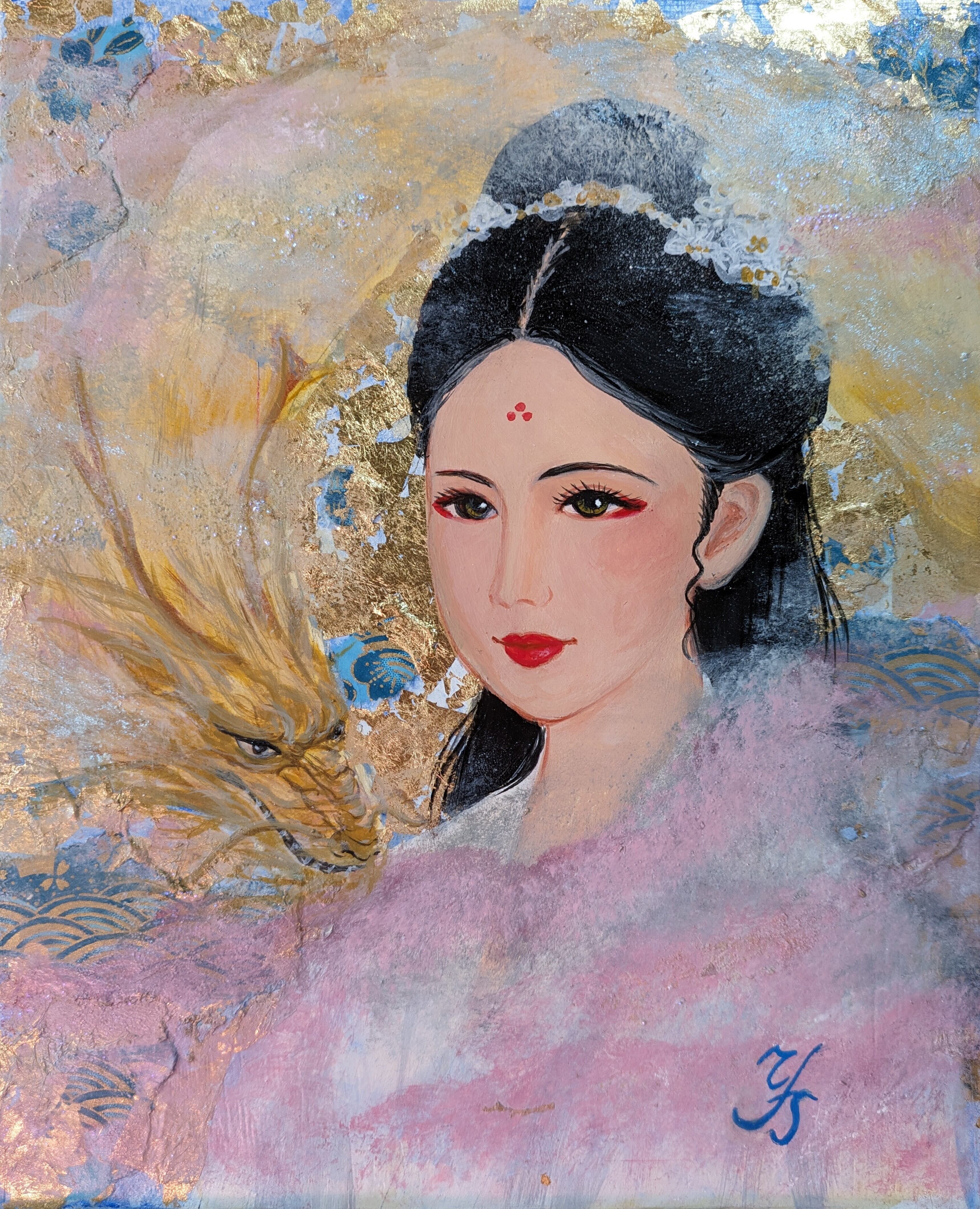 The gentle gaze carries an inner power, accompanied by the subtle presence of a dragon,