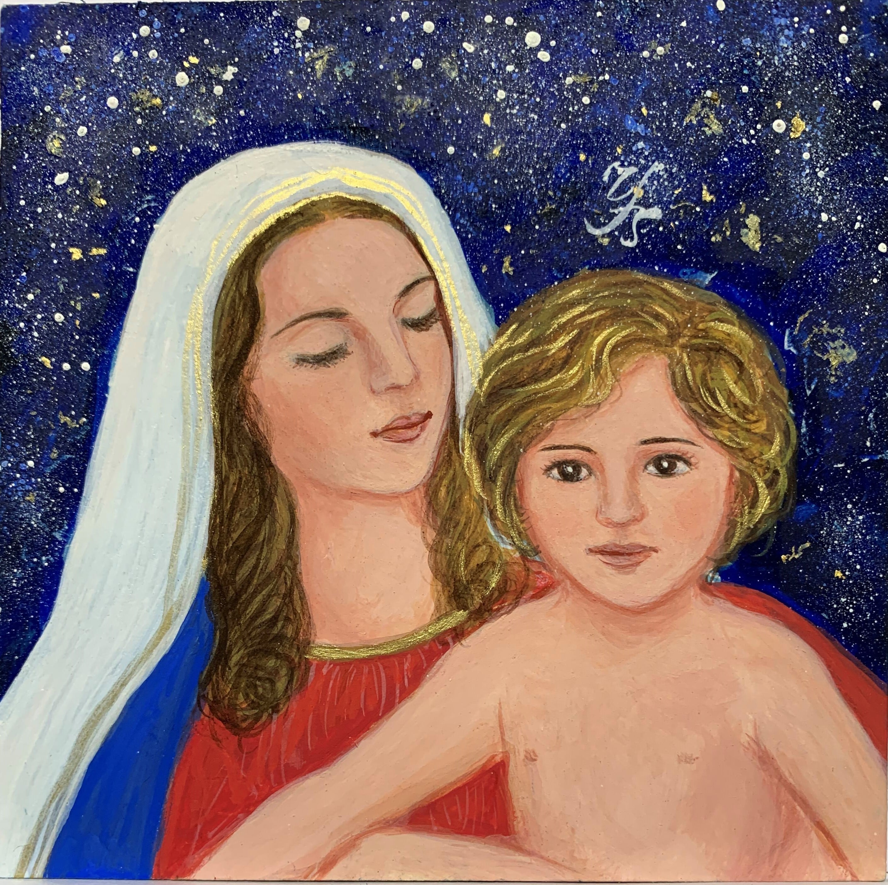 This work depicts the Madonna and Child, symbolizing unconditional love and the sacred bond between mother and child.